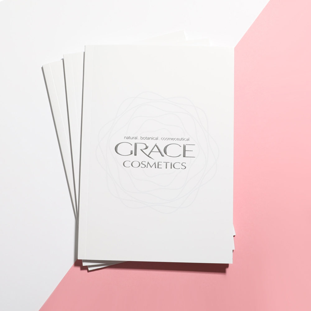 The Grace Cosmetics Brochure is printed on high quality 170GSM satin paper stock with matt varnishes and gloss varnishes over the products, so the beautiful range really stands out. The cover features a 270GSM satin finish, making the entire brochure look and feel as professional and high-quality as the products advertised within it.